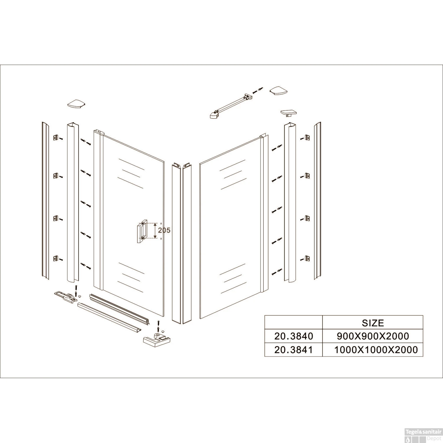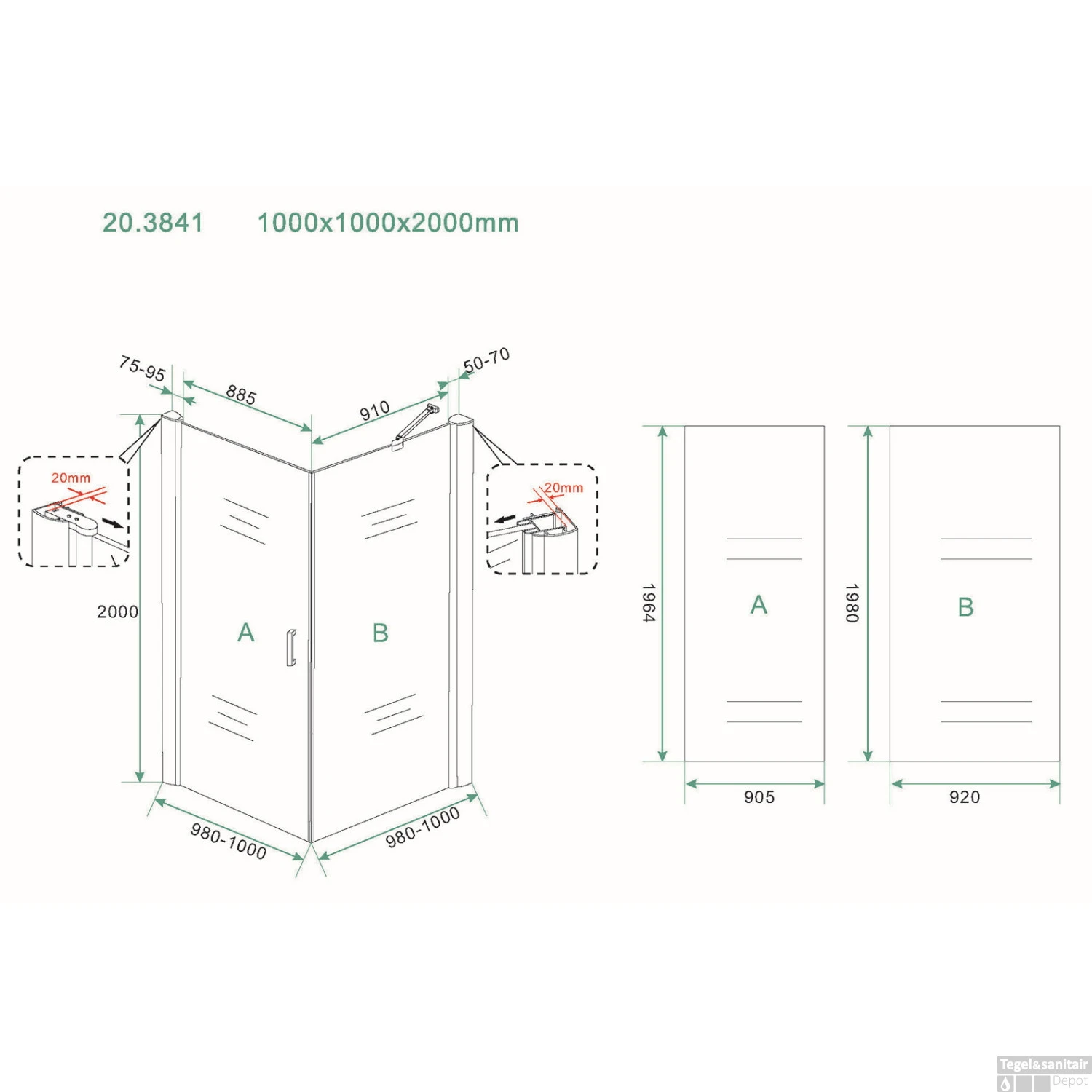LET OP: Omdat de cabine ook op een douchebak te plaatsen is zijn de afmetingen 2 á 3 cm kleiner als aangegeven op de specificaties