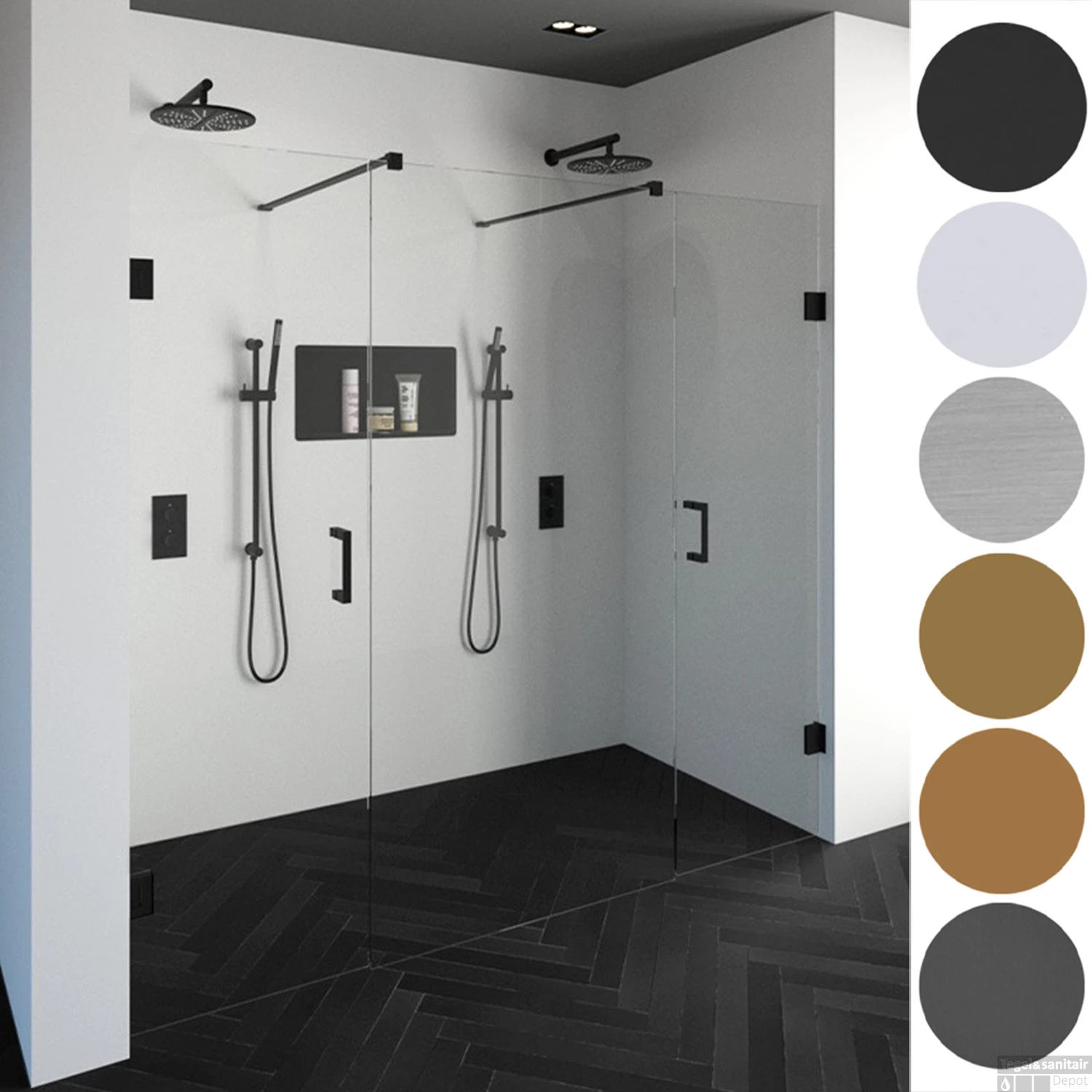 U heeft de mogelijkheid om uit zes verschillende kleuren beslag te kiezen, waardoor u uw douchecabine moeiteloos kunt aanpassen aan het design van uw badkamer. Chroom, geborsteld RVS, Mat Zwart, Goud, Koper of Gunmetal beslag? Bekijk de diverse mogelijkheden en pas dit toe in uw badkamer. De douchecabines zijn verkrijgbaar in de volgende kleuren en maten: