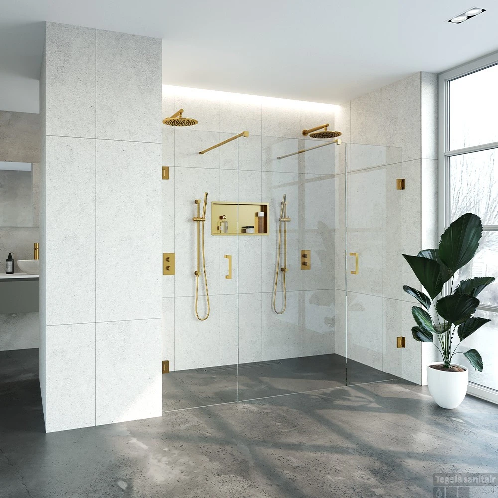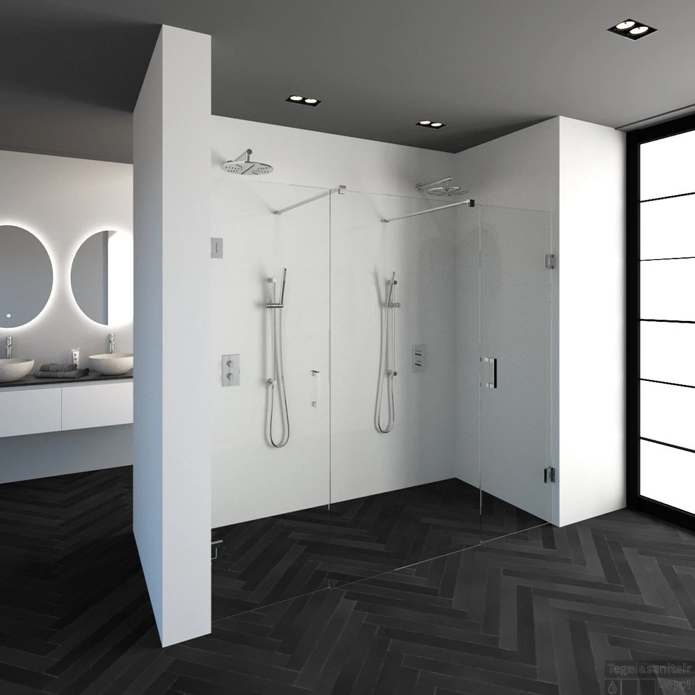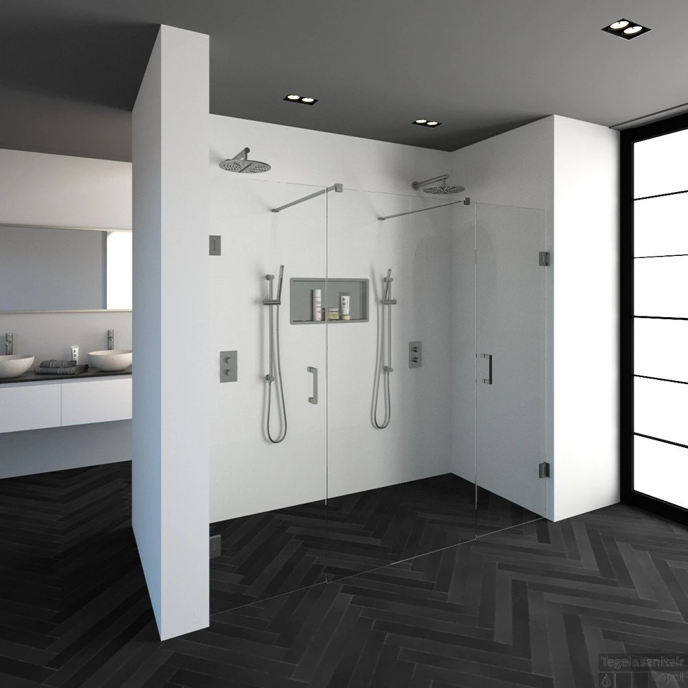 Deze complete niscabine bestaat uit een vrijstaande doorloopwand met twee draaideuren met beslag. Inclusief glasbehandeling en optionele kunststof profielen. De hoogte van de niscabine is 200 cm. Deze niscabine is modern straalt luxe uit door zijn design en kleur.