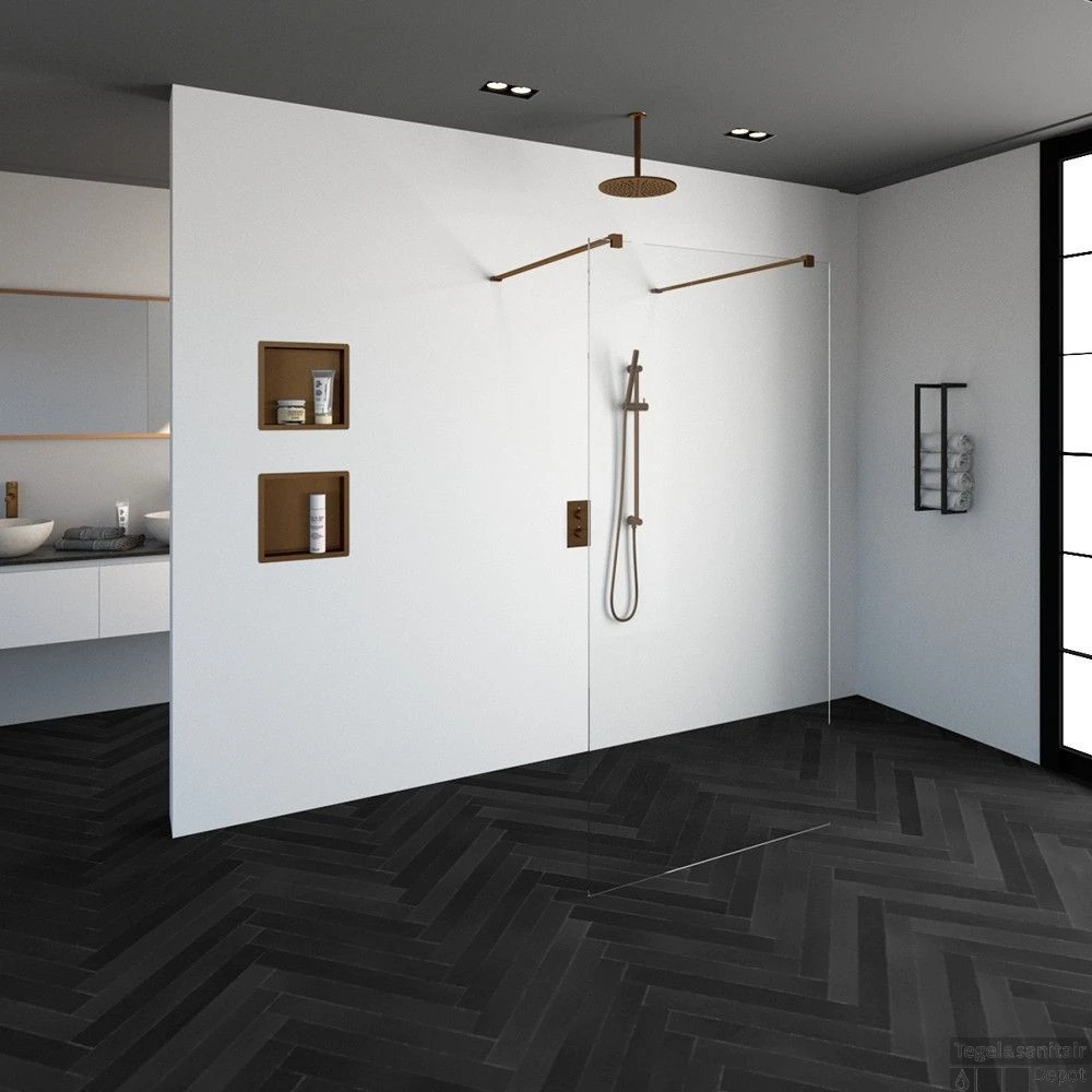 Als u graag minimalisme in uw badkamer wilt, is een doorloopdouche een goede keuze. Deze complete doorloopdouche bestaat uit een vrijstaande doorloopwand van ongeveer 100 cm breed en 200 cm hoog. Inclusief glasbehandeling. Deze doorloopdouche straalt luxe en rust uit door zijn design en koperkleur stabilisatiestang.