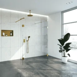 Als u graag minimalisme in uw badkamer wilt, is een doorloopdouche een goede keuze. Deze complete doorloopdouche bestaat uit een doorloopwand met twee vaste zijwanden. De doorloopwand is 140 cm breed en 200 cm hoog. De zijwanden zijn beide ongeveer 30 cm breed. Inclusief glasbehandeling. Deze doorloopdouche straalt luxe en rust uit door zijn design en Goudkleur accenten.