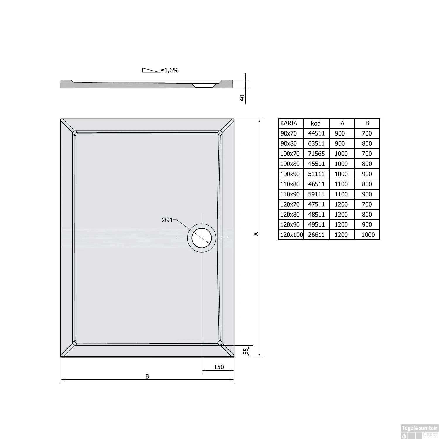 De douchebak is verkrijgbaar in verschillende maten.