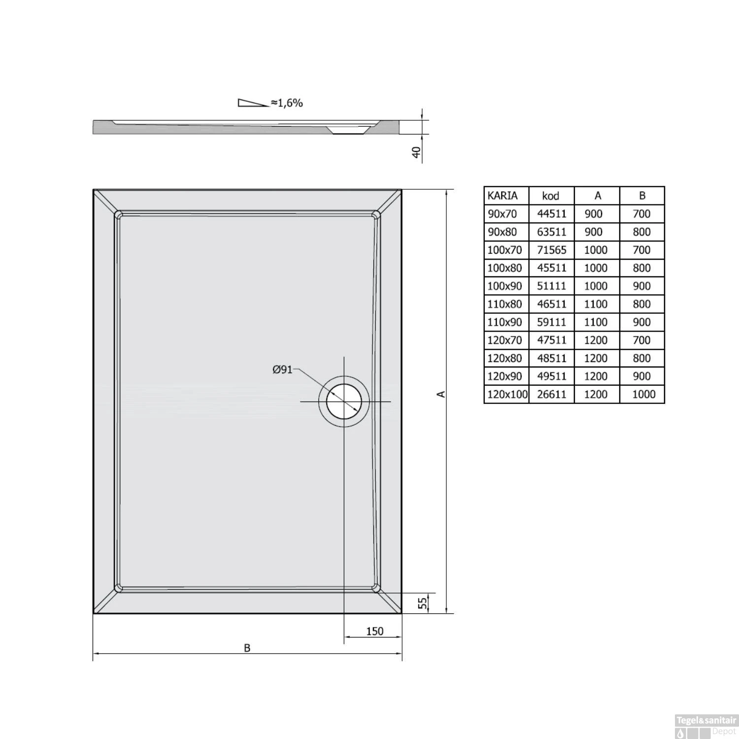 De douchebak is verkrijgbaar in verschillende maten.