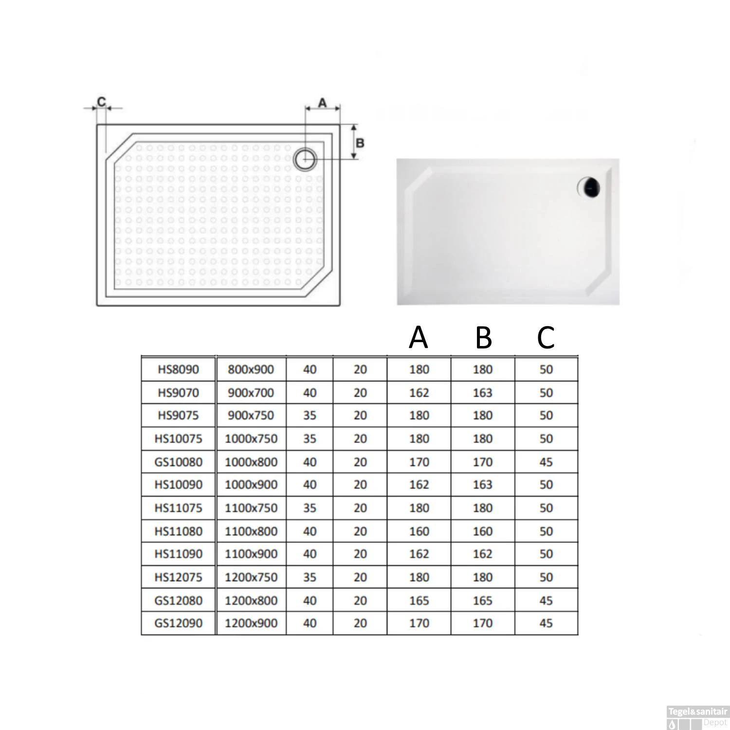 Specificaties Douchebak Gegoten Marmer 90x70x4 cm Rechthoek Wit Sapho Sara: