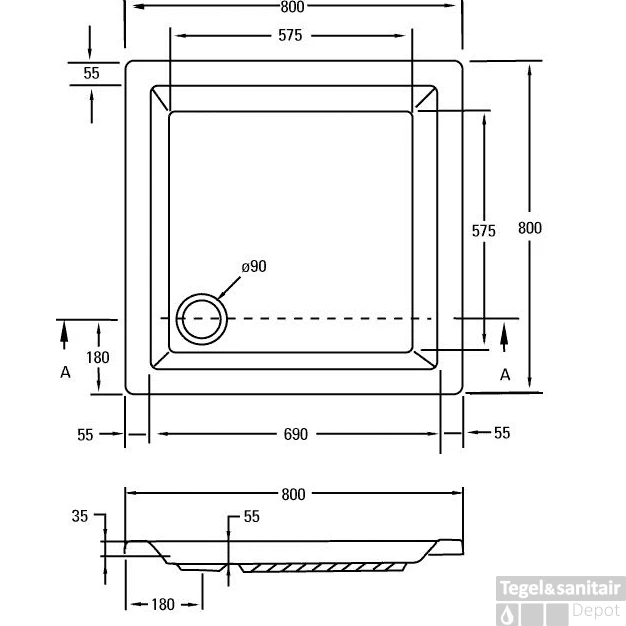 Specificaties Douchebak Kwadrant Acryl wit 80x80cm vierkant 5cm hoog: