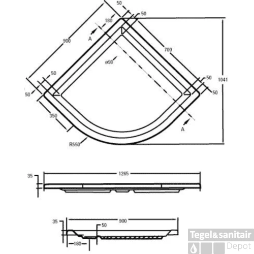 Kenmerken Douchebak Kwadrant Acryl Wit Kwartrond 90x90x5cm Radius 55: