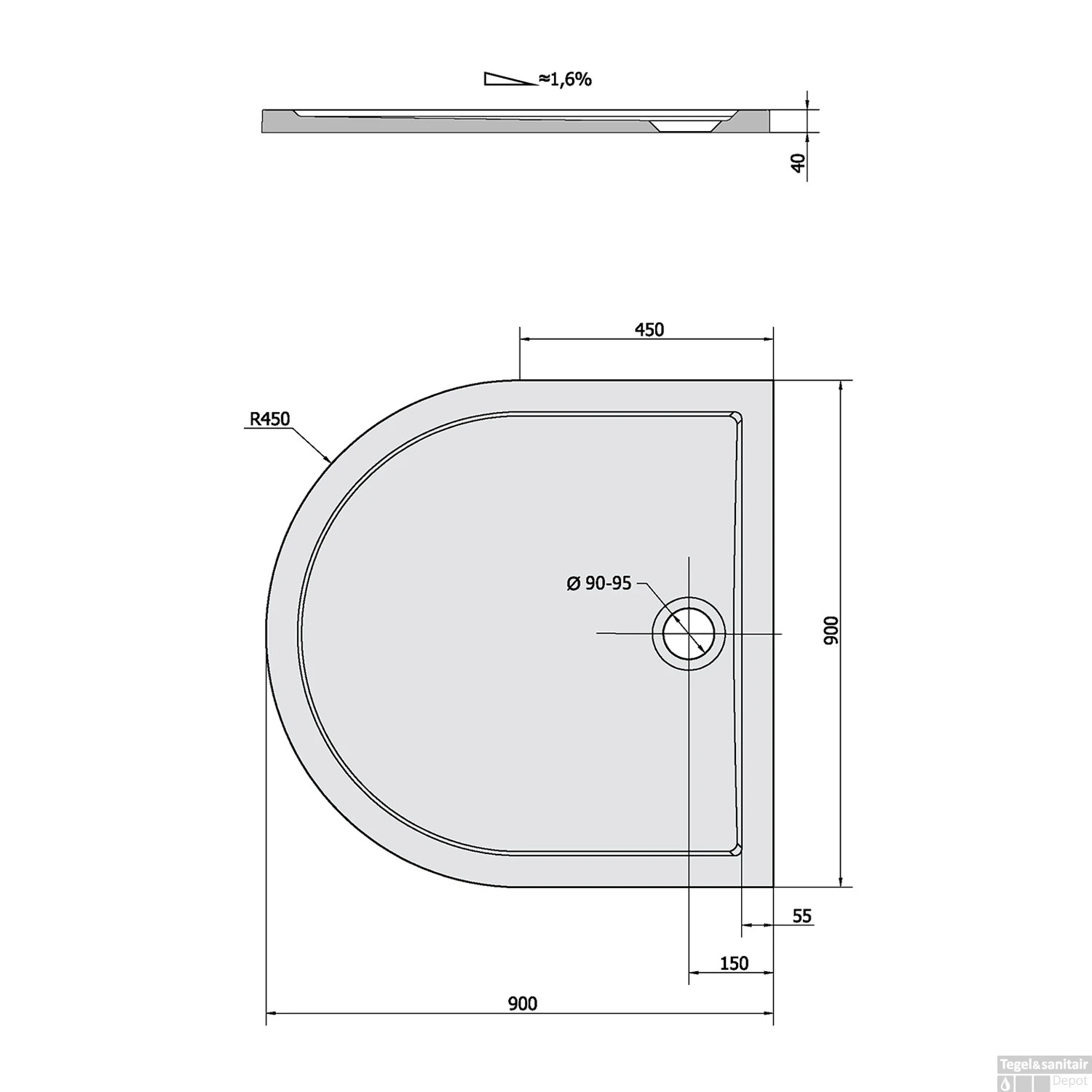 Specificaties Douchebak Polysan Klasik D-vorm 90x90x4cm Cast Marble Wit: