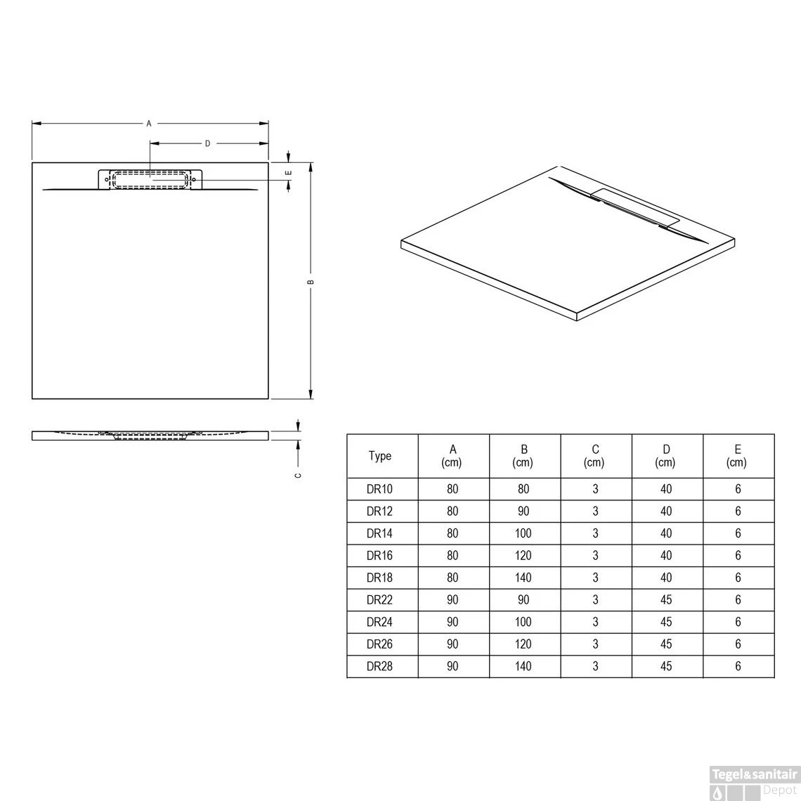 De afmetingen van deze douchebak zijn 90 cm breed en 80 cm diep. De douchebak is 3 cm hoog. Daarnaast is deze douchebak verkrijgbaar in 9 formaten van 80 of 90 cm breed en tussen de 80 en 140 cm diep. Ook is deze bak verkrijgbaar in drie verschillende matte kleuren: antraciet, licht grijs en wit.Â