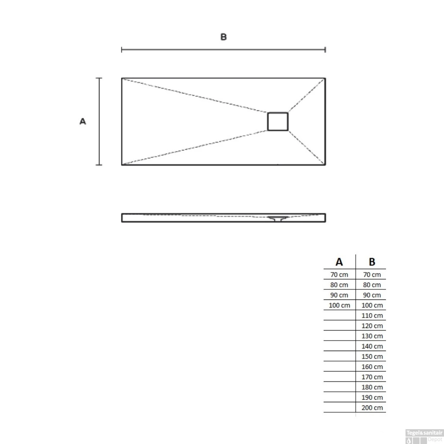 Deze douchebakken zijn leverbaar in diverse breedte- en lengtematen. De douchebak is beschikbaar in vier verschillende breedtes van 70 t/m 100 cm, terwijl de bak leverbaar is in liefst veertien verschillende lengtes van 70 t/m 200 cm: zodoende kunt u qua afmetingen met deze douchebak diverse kanten op en is er voor ieder wat wils. De diameter van het afvoergat bedraagt 90 mm, terwijl de douchebak een standaard hoogte van 2,8 cm heeft.