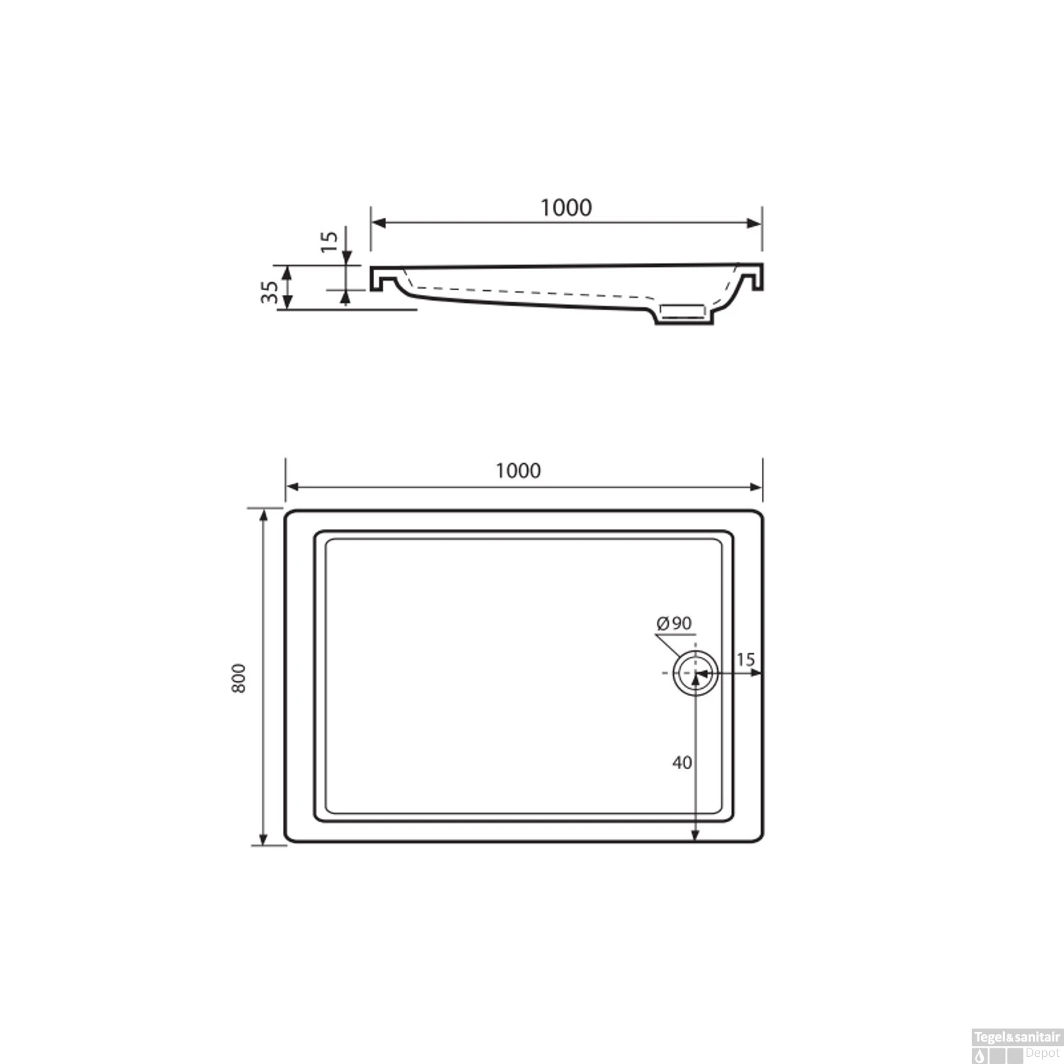 De vierkante douchebak is voorzien van een afvoergat met een diameter van 90mm aan de zijkant van de douchebak. Er wordt geen afvoer meegeleverd en ook de universele potenset zult u moeten bestellen.