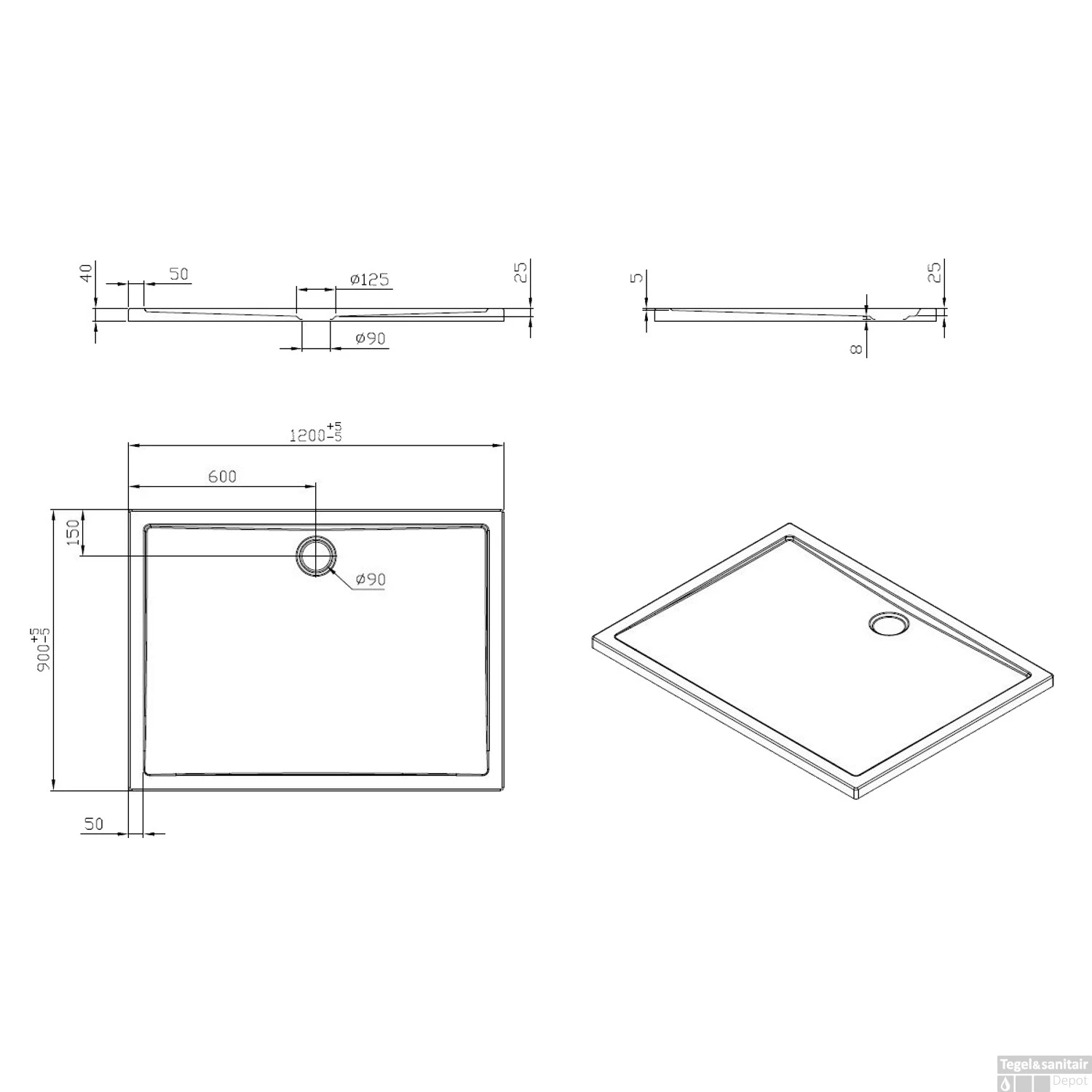 - – Rechthoekige douchebak van 120x90cm