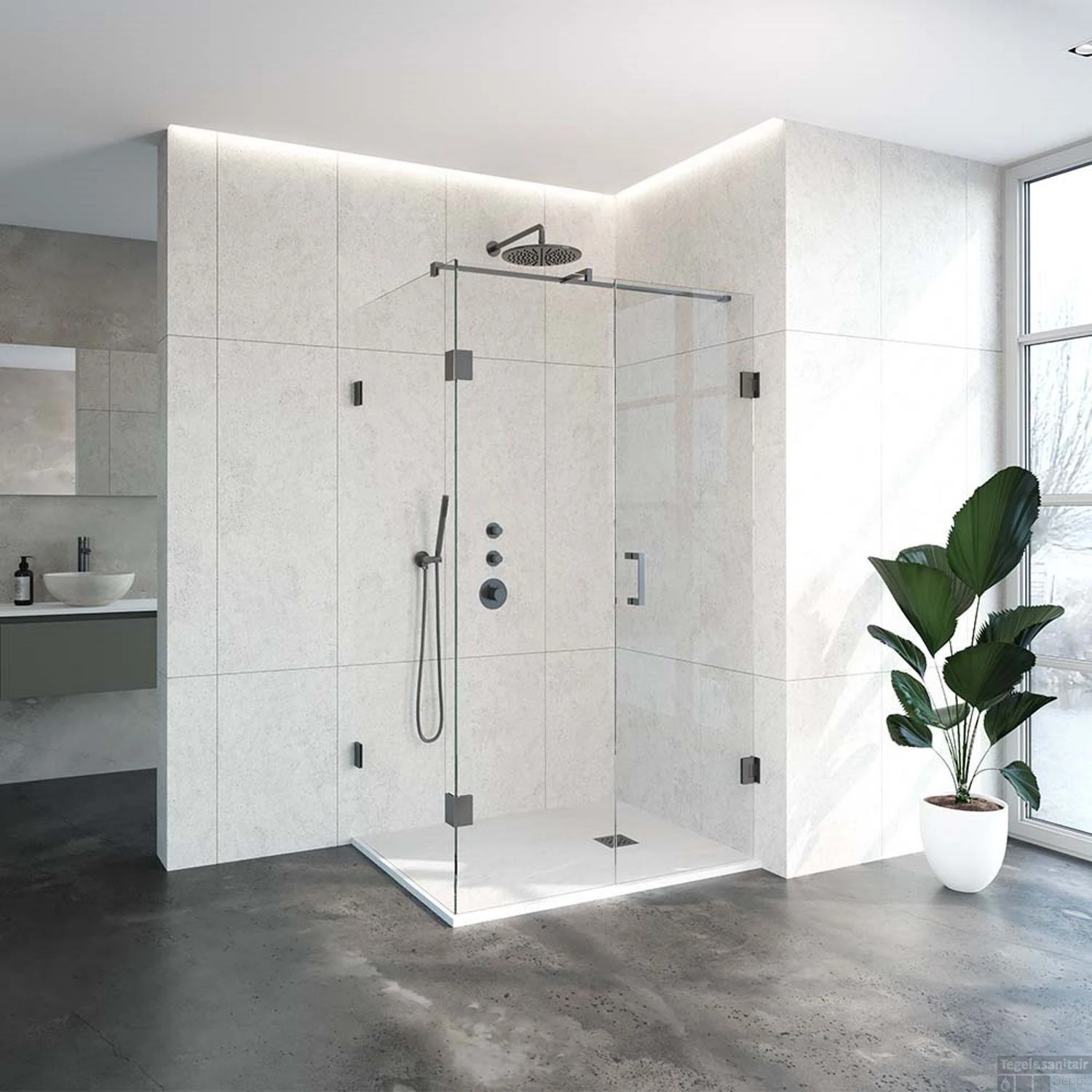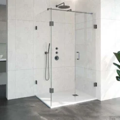 Deze complete douchecabine bestaat uit een inloopwand, zijwand en draaideur en Gunmetal beslag. Inclusief glasbehandeling en optionele kunststof profielen. De hoogte van de douchecabine is 200 cm. De cabine is 87,7 cm breed en 118 cm diep. Deze douchecabine straalt luxe uit door zijn design en kleur.