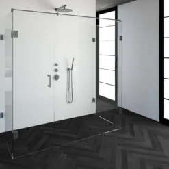 Deze complete douchecabine bestaat uit twee inloopwanden gekoppeld 90 cm, één inloopwand gekoppeld 60 cm en een draaideur 60 cm met RVS beslag. Inclusief glasbehandeling en optionele kunststof profielen. De hoogte van de douchecabine is 200 cm. De cabine is 198,8 cm breed en 87,7 cm diep. Deze douchecabine straalt luxe uit door zijn design en kleur.