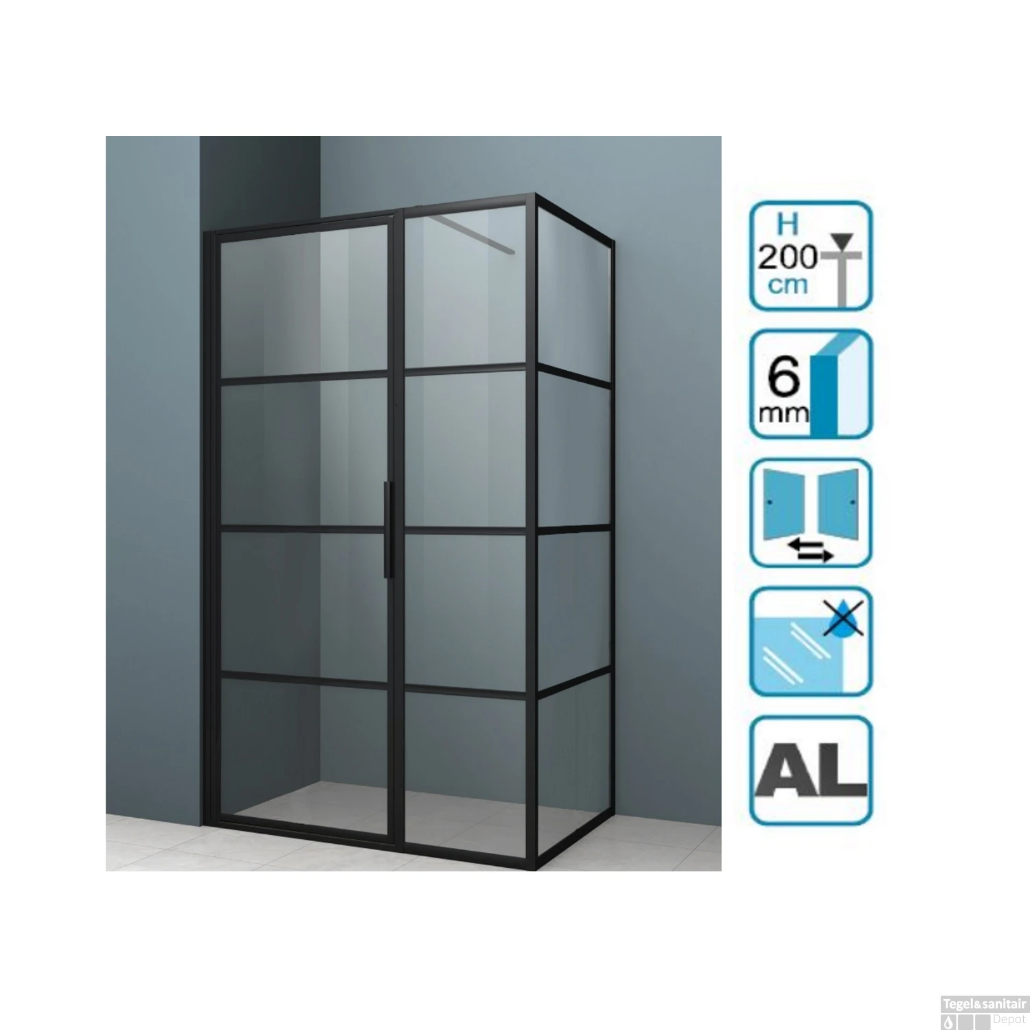 Deze douchecabine is afkomstig van het Italiaanse merk Lacus en behoort tot de Tremiti-serie. De cabine bestaat uit drie onderdelen die samen een mooi geheel vormen: een nisdeur, een vast paneel en een zijwand. Al deze glaswanden zijn voorzien van een fraai mat zwart profiel dat is gemaakt van aluminium. De hoogte van de wanden bedraagt 200 cm, terwijl alle wanden een glasdikte van 6 mm hebben.