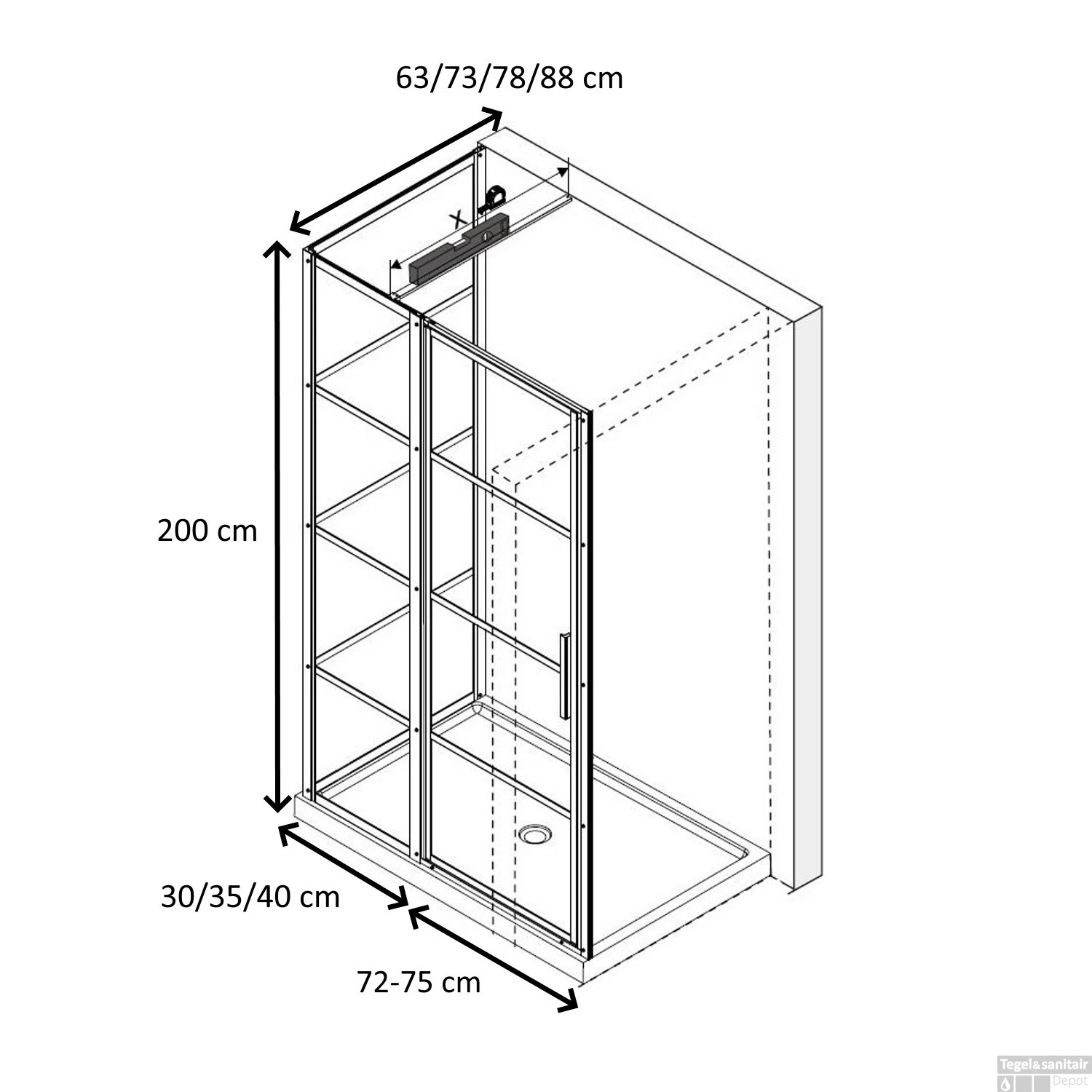 Het vaste paneel is leverbaar in breedtes van 30, 35 en 40 cm. Al deze panelen hebben een verstelbaarheid van 0,5 cm. De zijwanden zijn leverbaar in vier verschillende breedtes van 68, 73, 78 en 88 cm. Al deze wanden hebben zijn 1,5 cm omhoog te verstellen.