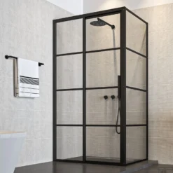Een moderne douchecabine met een duidelijke knipoog naar de rauwe inspiratie. De zwarte metalen frames zijn gebaseerd op industriële deuren. Nu natuurlijk alleen aan de buitenzijde toegepast, zodat de douche van binnen eenvoudig te onderhouden is. Maar ook de subtiel toegepaste zichtbare bouten zijn een knipoog naar de oorsprong.
