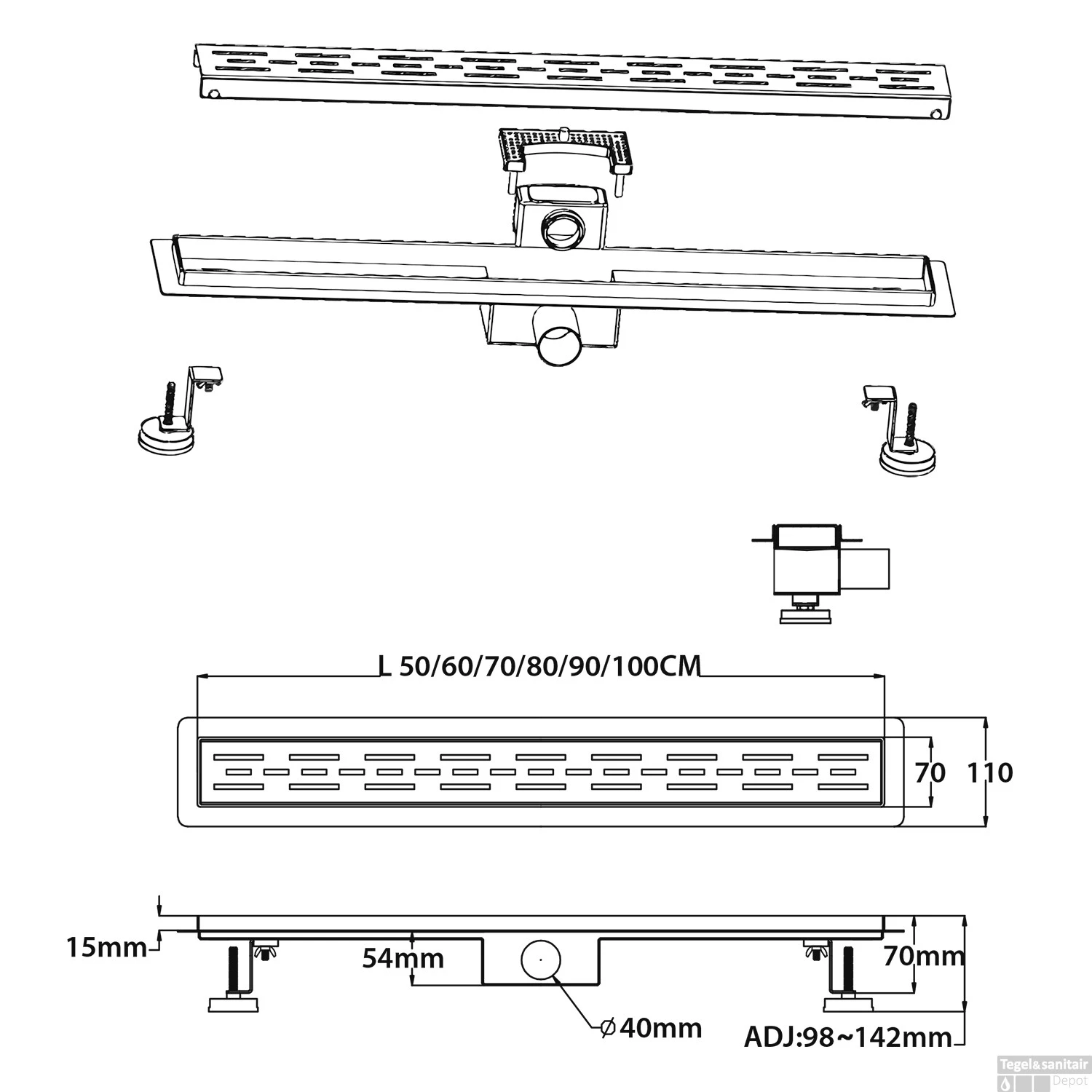Deze douchegoot heeft een diepte van 11 cm, een lengte van 70 cm, en een hoogte van 7 cm. De minimale inbouwdiepte is 7.0 cm, de maximale inbouwdiepte is 14.5 cm, dit is in te stellen in elke maat die hiertussen valt door middel van de stelvoeten.