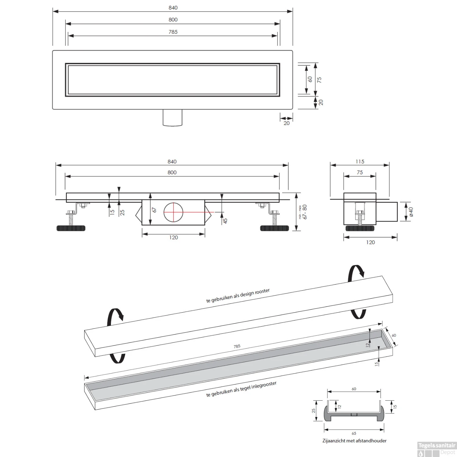 Specificaties Douchegoot Brauer Zero RVS Inclusief Vloerflens 80×7 cm Tegelinlegrooster Omkeerbaar
