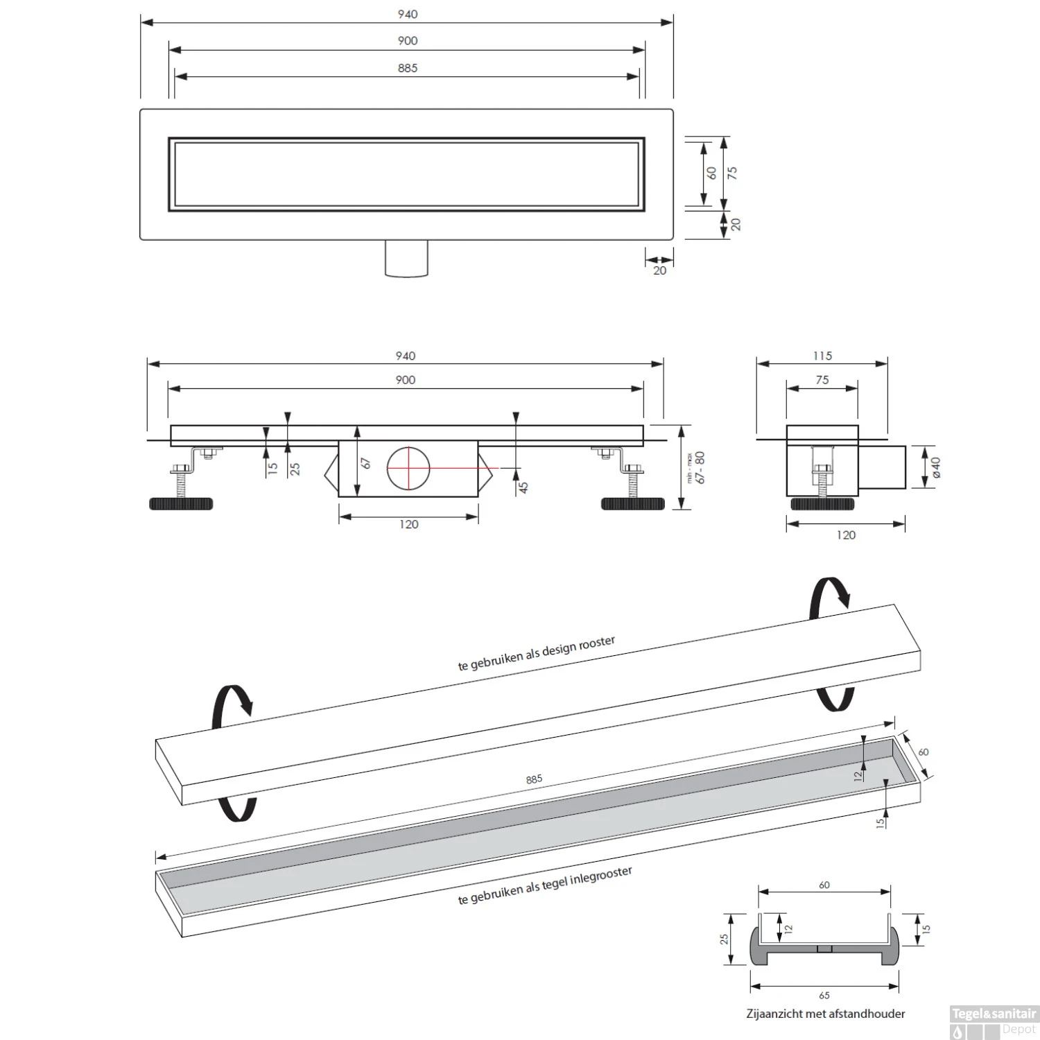 Specificaties Douchegoot Brauer Zero RVS Inclusief Vloerflens 90×7 cm Tegelinlegrooster Omkeerbaar