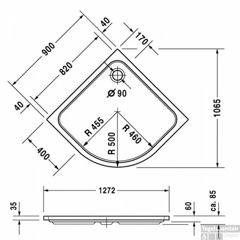 Kwartronde douchebak 90×8,5 cm.