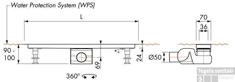 Easydrain Xs Taf Douchegoot 60 Cm. Met Rooster Z1 Waterslot 50mm. Rvs Geborsteld
