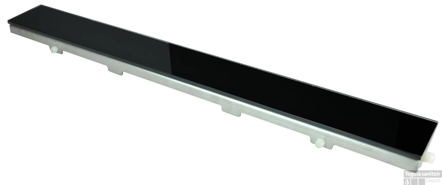 Vervang het standaard RVS rooster door dit stijlvol glasrooster zwart, gemonteerd op een RVS frame. Maat 1000×70 tbv RVS 3e Generatie douchegoot, zonder flens, met flens, en muurflens!