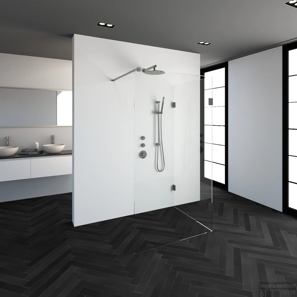 Deze complete inloopdouche bestaat uit twee inloopwanden met RVS beslag. Inclusief glasbehandeling. De hoogte van de inloopdouche is 200 cm. Hij is 108,3 cm breed en 97,7 cm diep. Deze inloopdouche straalt luxe uit door zijn design en kleur.
