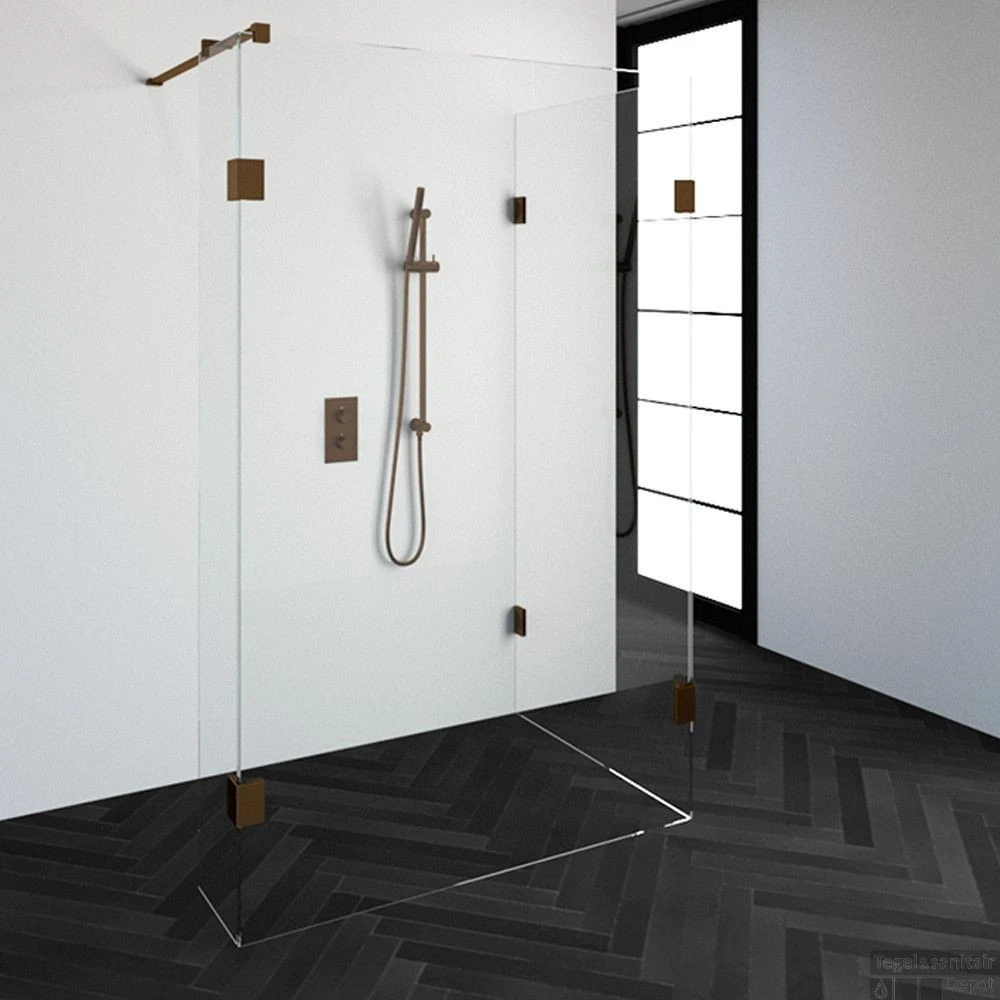 Deze complete inloopdouche bestaat uit twee inloopwanden en en een zijwand met koper beslag. Inclusief glasbehandeling. De hoogte van de inloopdouche is 200 cm. Hij is 128,3 cm breed en 87,7 cm diep. Deze inloopdouche straalt luxe uit door zijn design en kleur.
