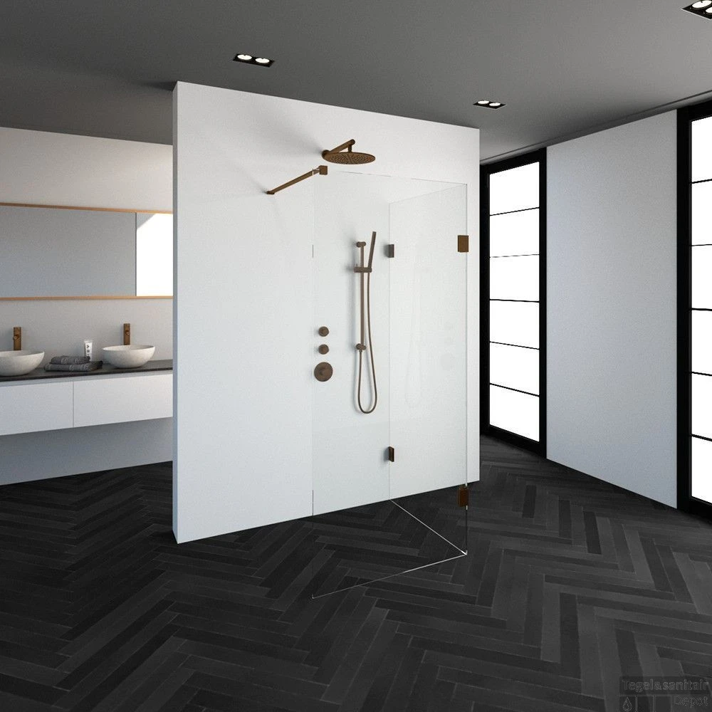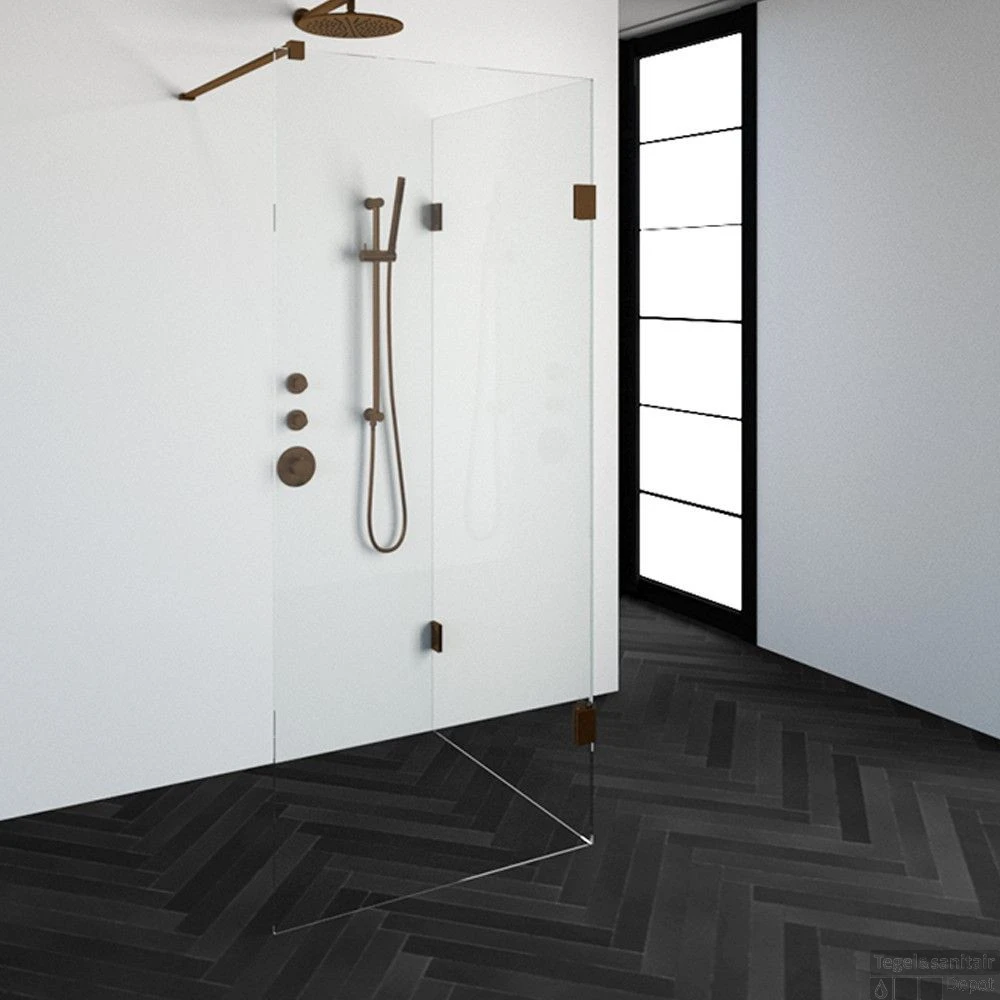 Deze complete inloopdouche bestaat uit twee inloopwanden met koper beslag. Inclusief glasbehandeling. De hoogte van de inloopdouche is 200 cm. Hij is 88,3 cm breed en 87,7 cm diep. Deze inloopdouche straalt luxe uit door zijn design en kleur.
