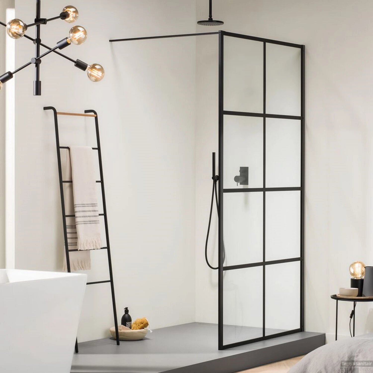 De stoere douchewand is te plaatsen op een douchebak van 117.3-118.7 cm.