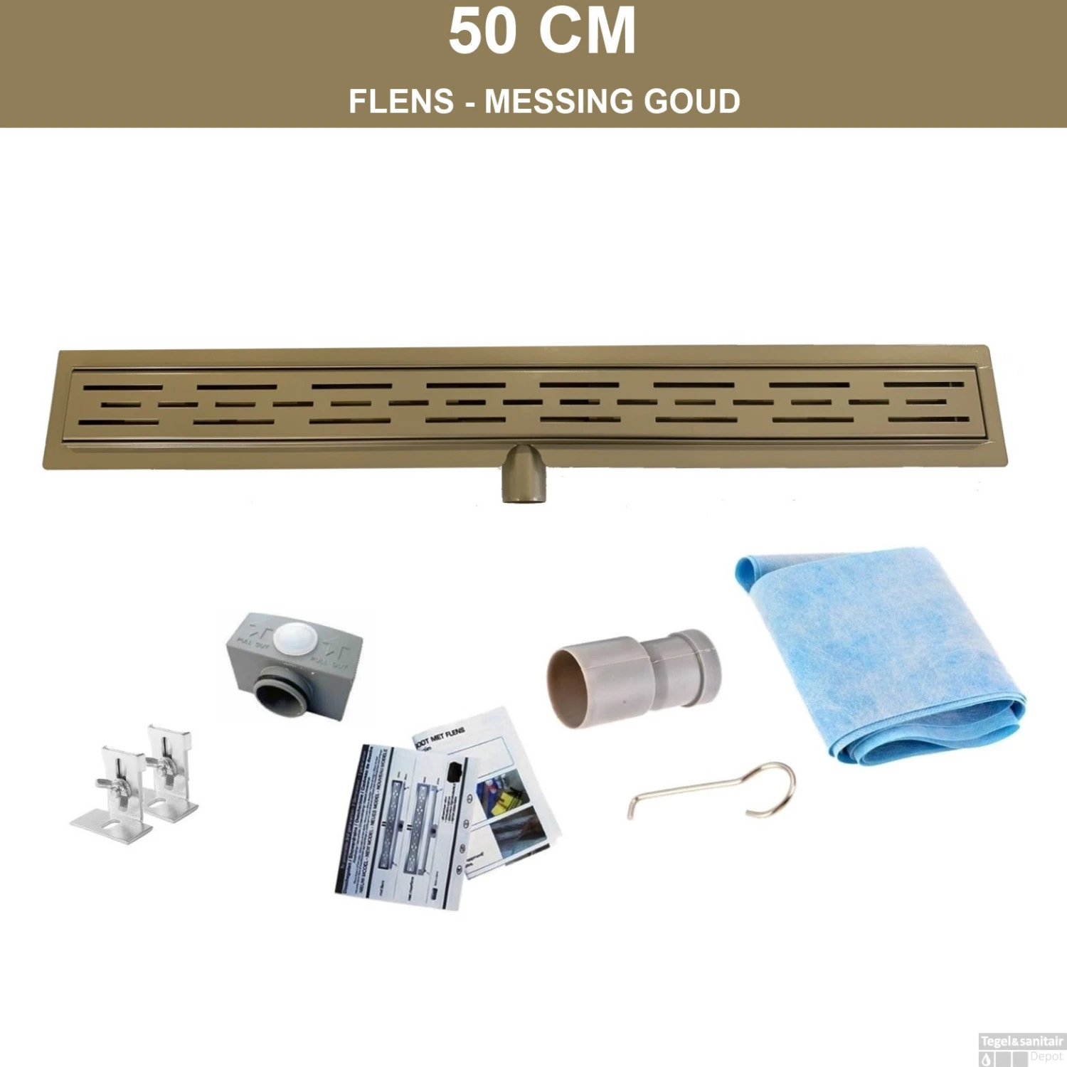 Messing Goud RVS Douchegoot Flens met Uitneembaar Sifon 50x7cm 6,7cm Diep MESSING GOUD ROOSTER