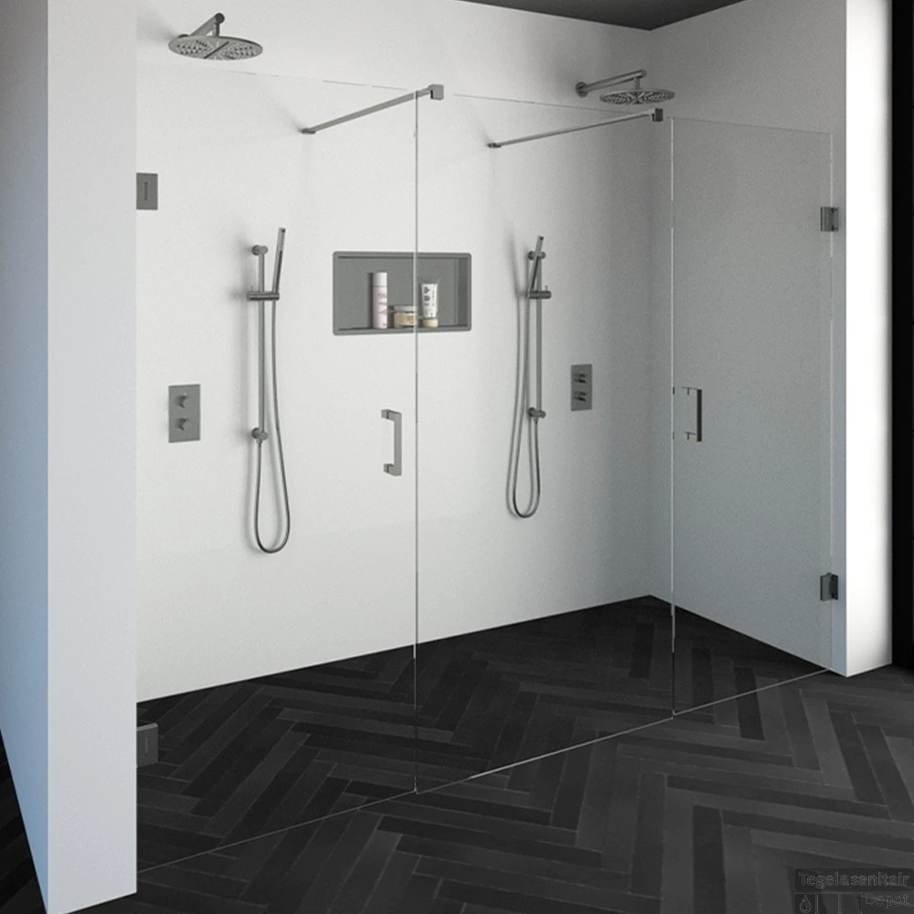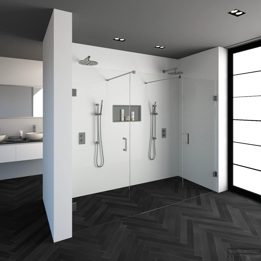 Deze complete niscabine bestaat uit een vrijstaande doorloopwand met twee draaideuren met RVS beslag. Inclusief glasbehandeling en optionele kunststof profielen. De hoogte van de niscabine is 200 cm. Deze niscabine is modern straalt luxe uit door zijn design en kleur.
