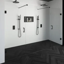 Deze complete niscabine bestaat uit een vrijstaande doorloopwand met twee draaideuren met Mat Zwart beslag. Inclusief glasbehandeling en optionele kunststof profielen. De hoogte van de niscabine is 200 cm. Deze niscabine is modern straalt luxe uit door zijn design en kleur.