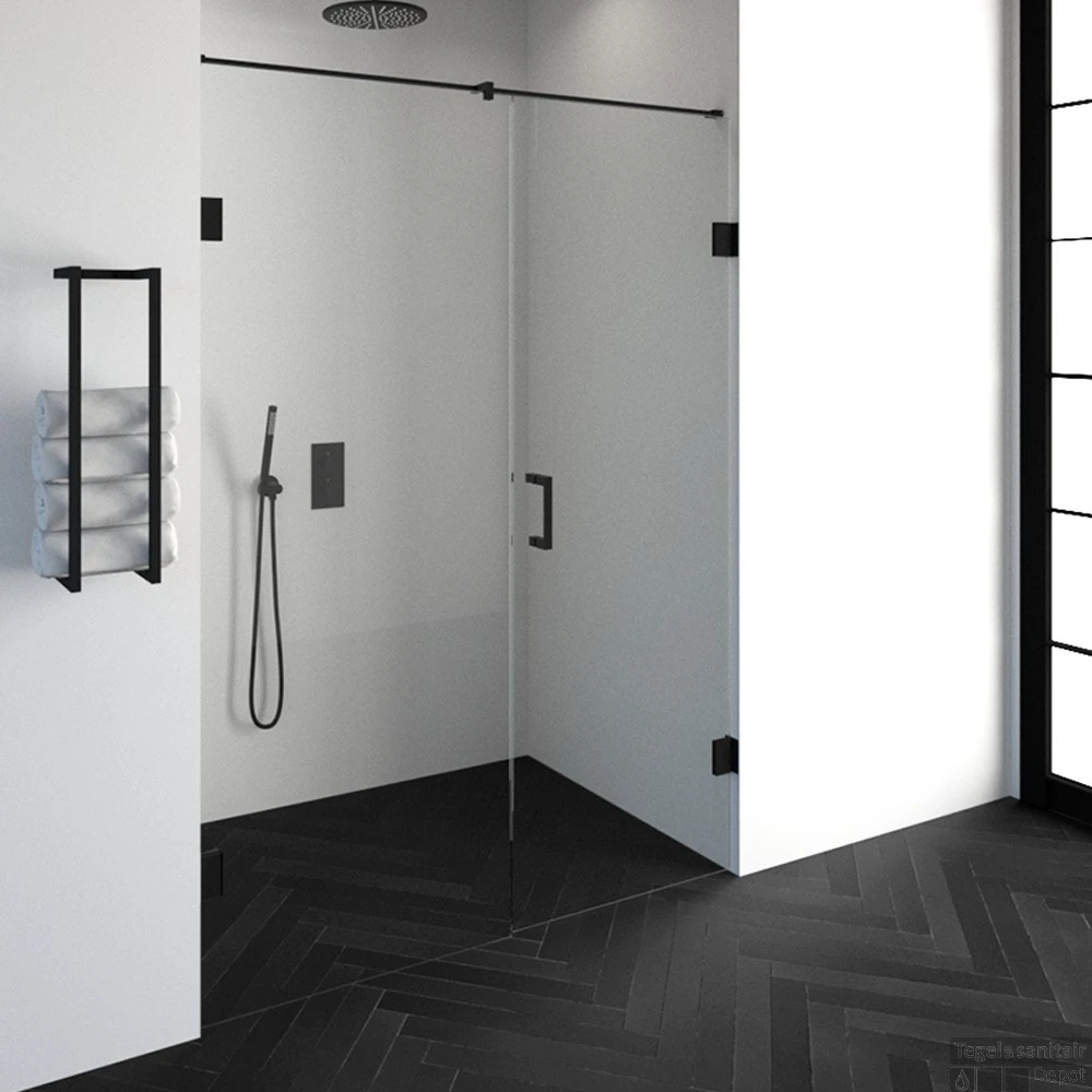 Deze complete nisdeur bestaat uit een inloopwand en draaideur met Mat Zwart beslag. Inclusief glasbehandeling en optionele kunststof profielen. De hoogte is 200 cm. Deze nisdeur straalt luxe uit door zijn design en kleur.