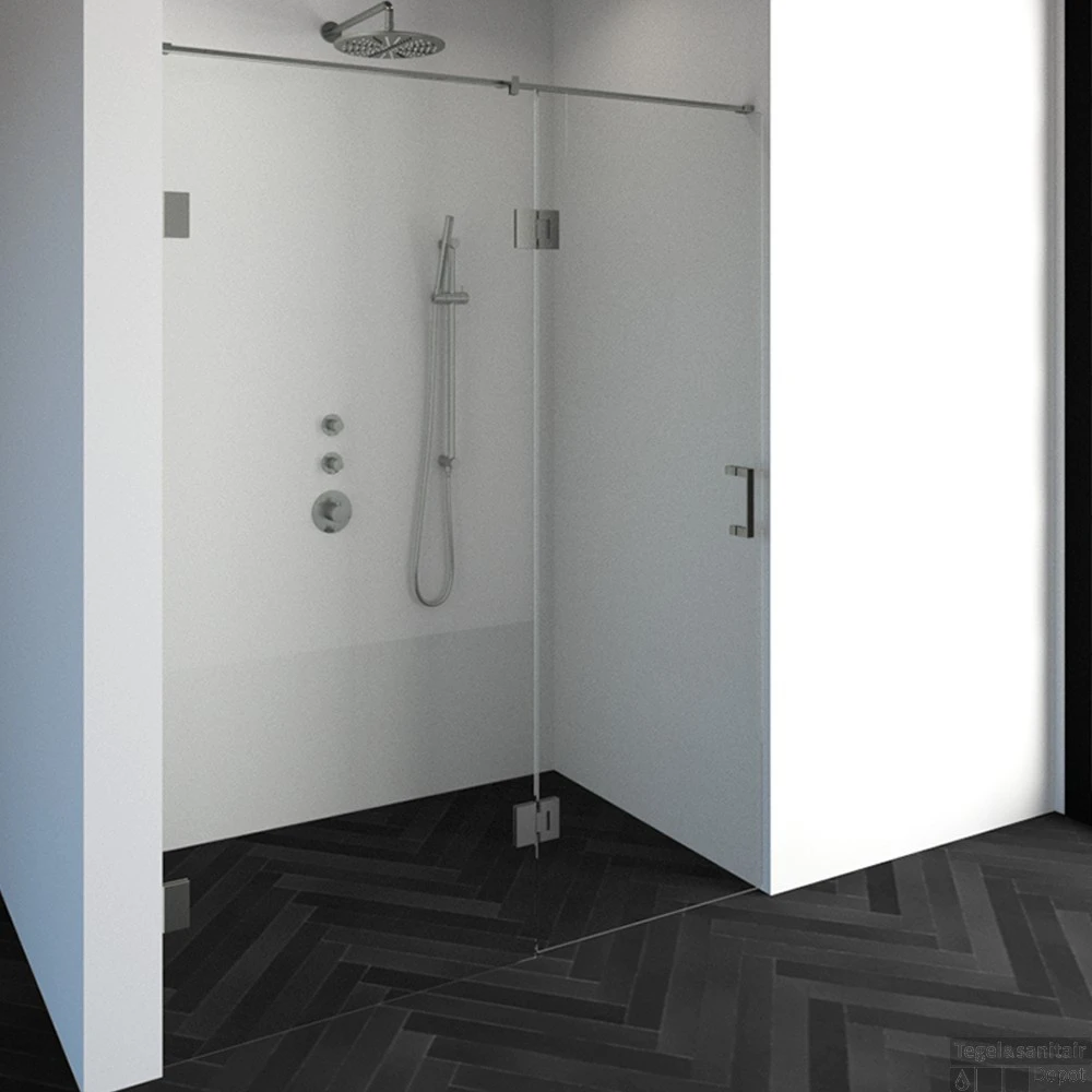 Deze complete nisdeur bestaat uit een inloopwand en draaideur met RVS beslag. Inclusief glasbehandeling en optionele kunststof profielen. De hoogte is 200 cm. Deze nisdeur straalt luxe uit door zijn design en kleur. De draaideur wordt met een glasscharnier bevestigd op de inloopwand.