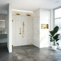 Deze complete nisdeur bestaat uit een inloopwand en draaideur met Goud beslag. Inclusief glasbehandeling en optionele kunststof profielen. De hoogte is 200 cm. Deze nisdeur straalt luxe uit door zijn design en kleur. De draaideur wordt met een glasscharnier bevestigd op de inloopwand.