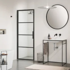 Moderne deuren met een duidelijke knipoog naar de rauwe inspiratie. De zwarte metalen frames zijn gebaseerd op industriële deuren. Nu natuurlijk alleen aan de buitenzijde toegepast, zodat de douche van binnen eenvoudig te onderhouden is. Maar ook de subtiel toegepaste zichtbare bouten zijn een knipoog naar de oorsprong.