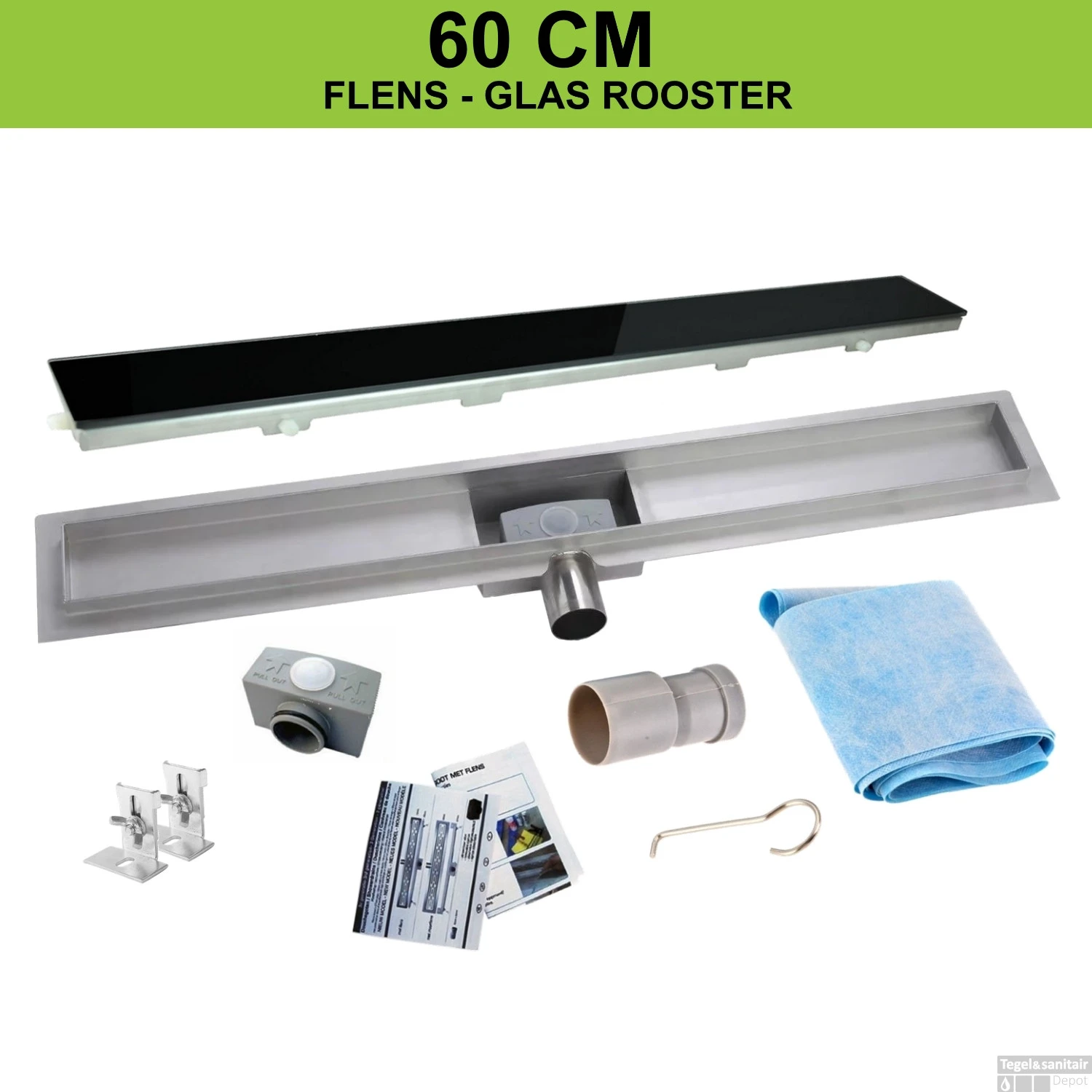 RVS Douchegoot flens met uitneembaar sifon 60x7cm 6,7cm diep GLAS ROOSTER