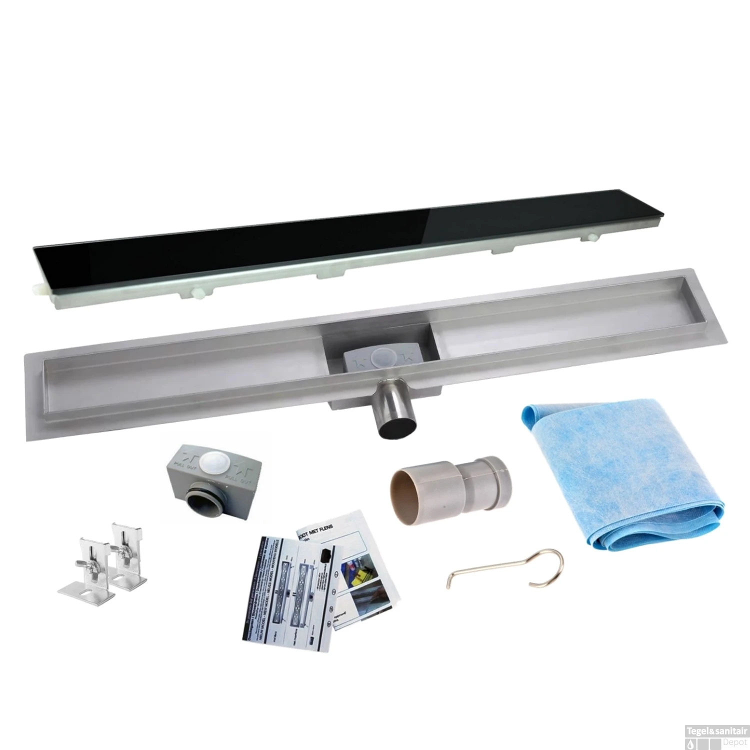 De douchegoot is voorzien van een glasrooster. De lange glasplaat heeft een donkere uitvoering en maakt zeker het verschil in uw badkamer. Het glasrooster valt op in uw douchecabine en in combinatie met andere zwarte details maakt u het complete plaatje af. Het glasrooster is 70 centimeter lang en slechts 7 centimeter breed. Ook verkrijgbaar in andere maten.