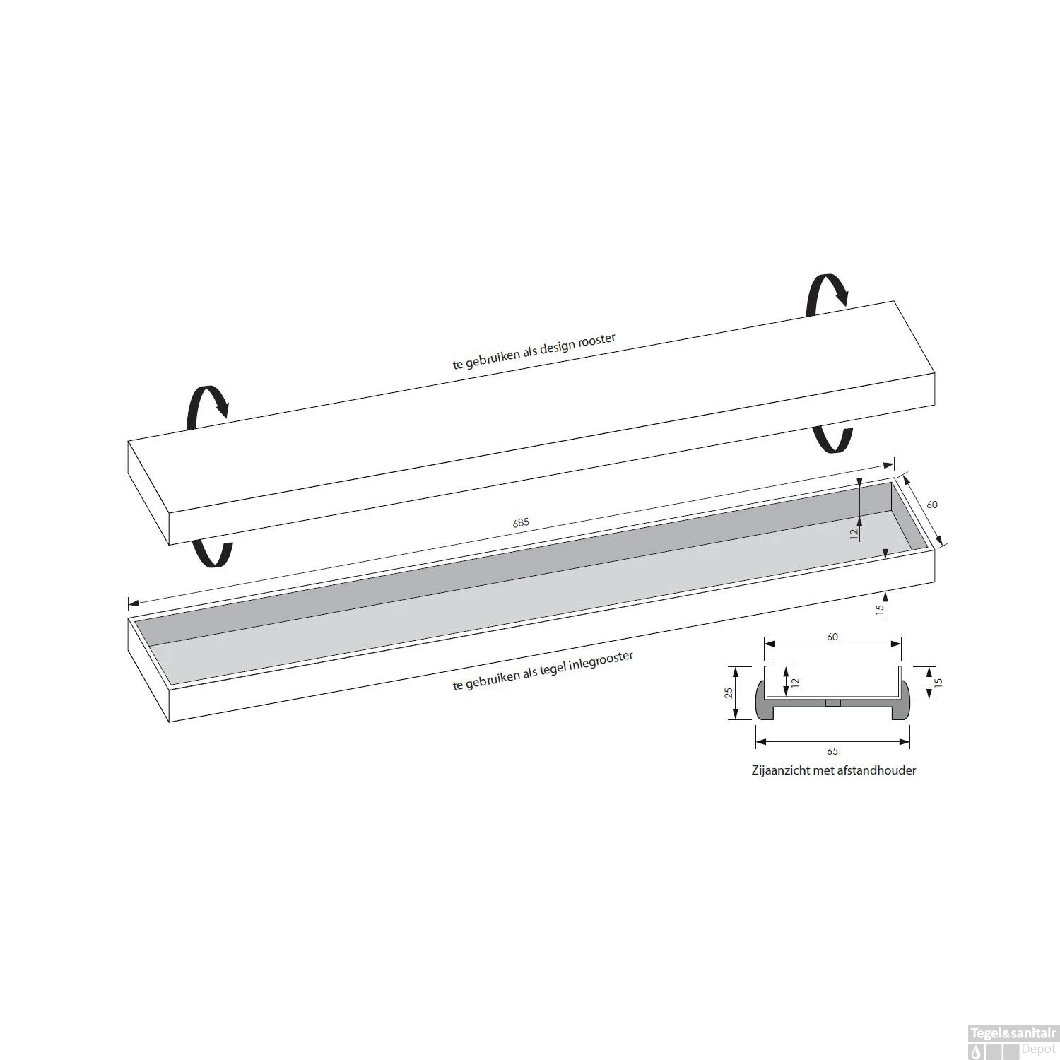 Een los tegelinlegrooster tbv de douchegoten van Brauer. Dit rooster is geschikt voor de douchegoot types STD/W/PS. De afmeting van het rooster is 70×7 en heeft de kleur van geborsteld gunmetal. Het rooster kunt u op twee verschillende manieren plaatsen. U kunt kiezen voor de Zero look, waarbij het rooster helemaal dicht is, of het tegelinlegrooster, waarbij u de douchegoot helemaal weg laat vallen tussen uw tegels. (Zie afbeeldingen)