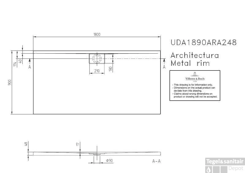 Villeroy & Boch Architectura Metal Rim Douchebak 180x90x4.8 Cm. Wit